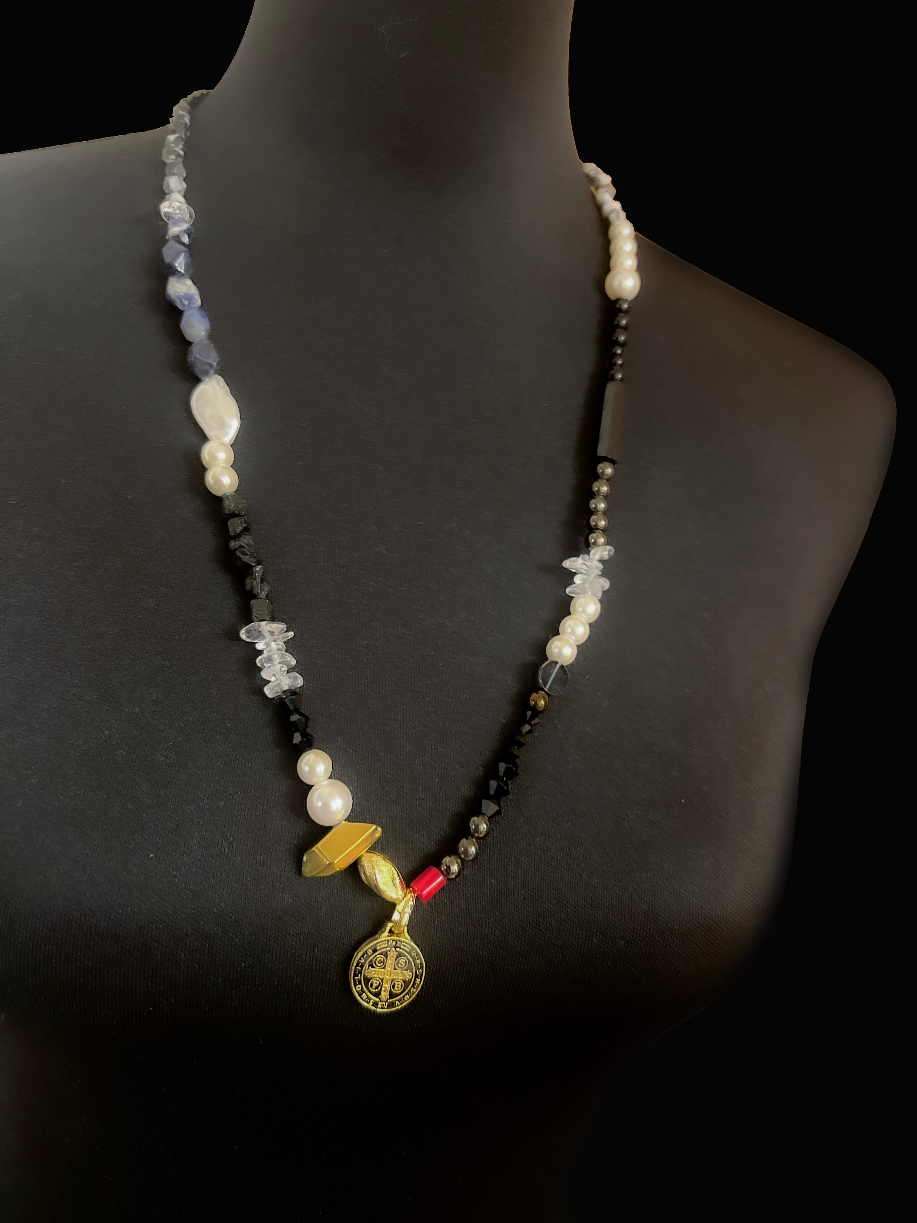 厳選された天然石とアンティーク調のパーツを組み合わせた、ロングネックレス。